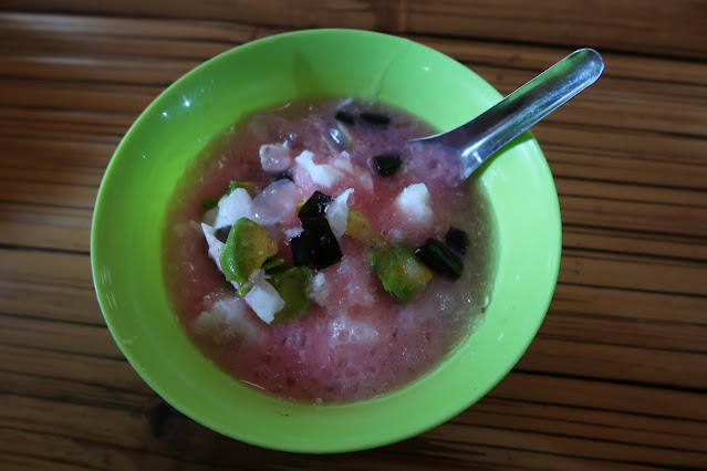 Terakhir, dessertnya nih Coy ! Es campur yang terdiri dari degan atawa kelapa muda, kolang-kaling, jeli, cincau, tape singkong, dan alpukat yang disiram es serut + sirop merah jambu + kental manis. Rasanya manis dan segerrrr banget. Pas bener mengguyur tenggorokan setelah berhuhah-huhah dengan bebek plus aneka sambel-sambelannya itu. Over all, makanannya konsisten enak dari jaman kami masih pacaran dulu. Rate harga untuk 2 orang sih antara Rp 70 ribu-80 ribuan lah.