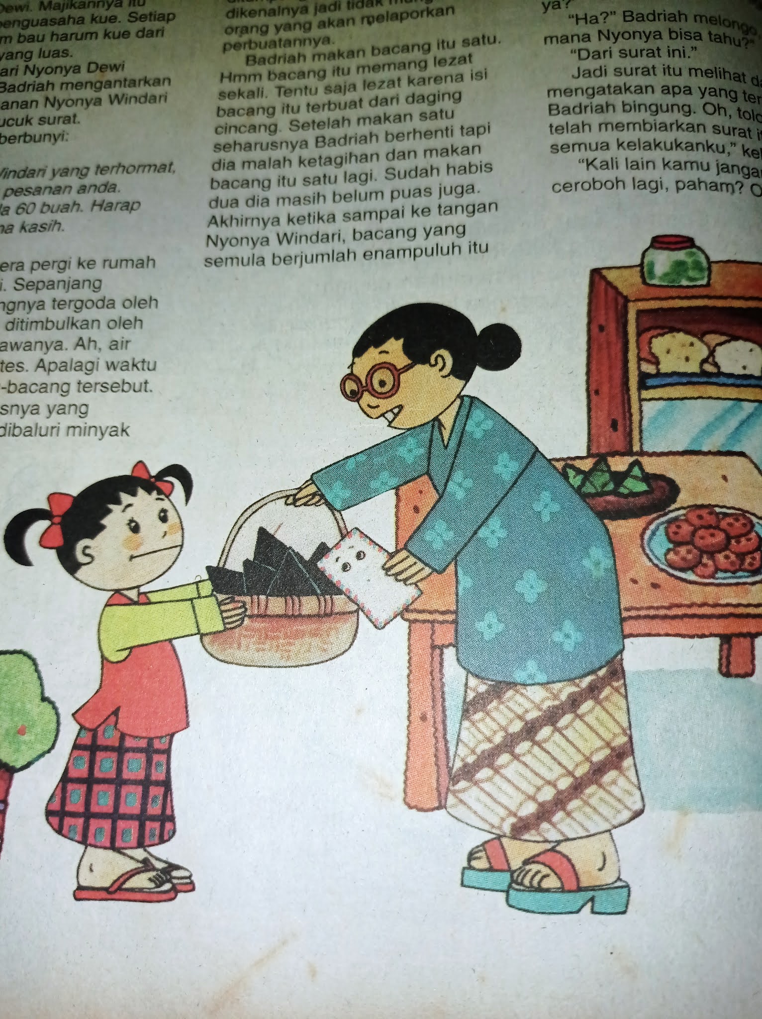 Badriah adalah seorang gadis desa yang buta huruf. Ia bekerja selama 2 bulan di rumah Nyonya Dewi yang merupakan pengusaha kue. Suatu hari, Nyonya Dewi menyuruh Badriah mengantarkan pesanan bacang Nyonya Windari yanh disertai dengan sepucuk surat. Dalam surat tersebut mengatakan bahwa jumlah bacangnya ada 60 buah. Saat di jalan Badriah tergoda untuk mencicipi bacangnya. Karena tidak bisa membaca, ia pun asal saja mencomot sebuah. Dipikirnya kalau berkurang 1 tidak akan ketahuan. Eh, habis makan 1 masih pengen nambah lagi karena isinya manis sebab isinya daging cincang. Mana dari luar bungkus daunnya kelihatan mengkilat karena minyak lagi. Sungguh menggiurkan. Makanya ia ambil lagi sampai kemudian habis 3. Setelah balik ke tempat Nyonya Dewi, betapa terkejutnya majikannya itu karena ia dapat surat dari Nyonya Windari bahwa bacangnya cuma ada 57 buah. Nyonya Dewi pun memanggil Badriah dan bertanya apa ia yang memakannya. Setelah Badriah mengaku, ia dinasihati Nyonya Dewi supaya jangan ceroboh karena bisa membuat pelanggannya tak percaya. Badriah heran juga kenapa aksinya ini bisa ketahuan. Ia kemudian berpikir bahwa suratnya punya mata sehingga bisa melihat kelakuannya.