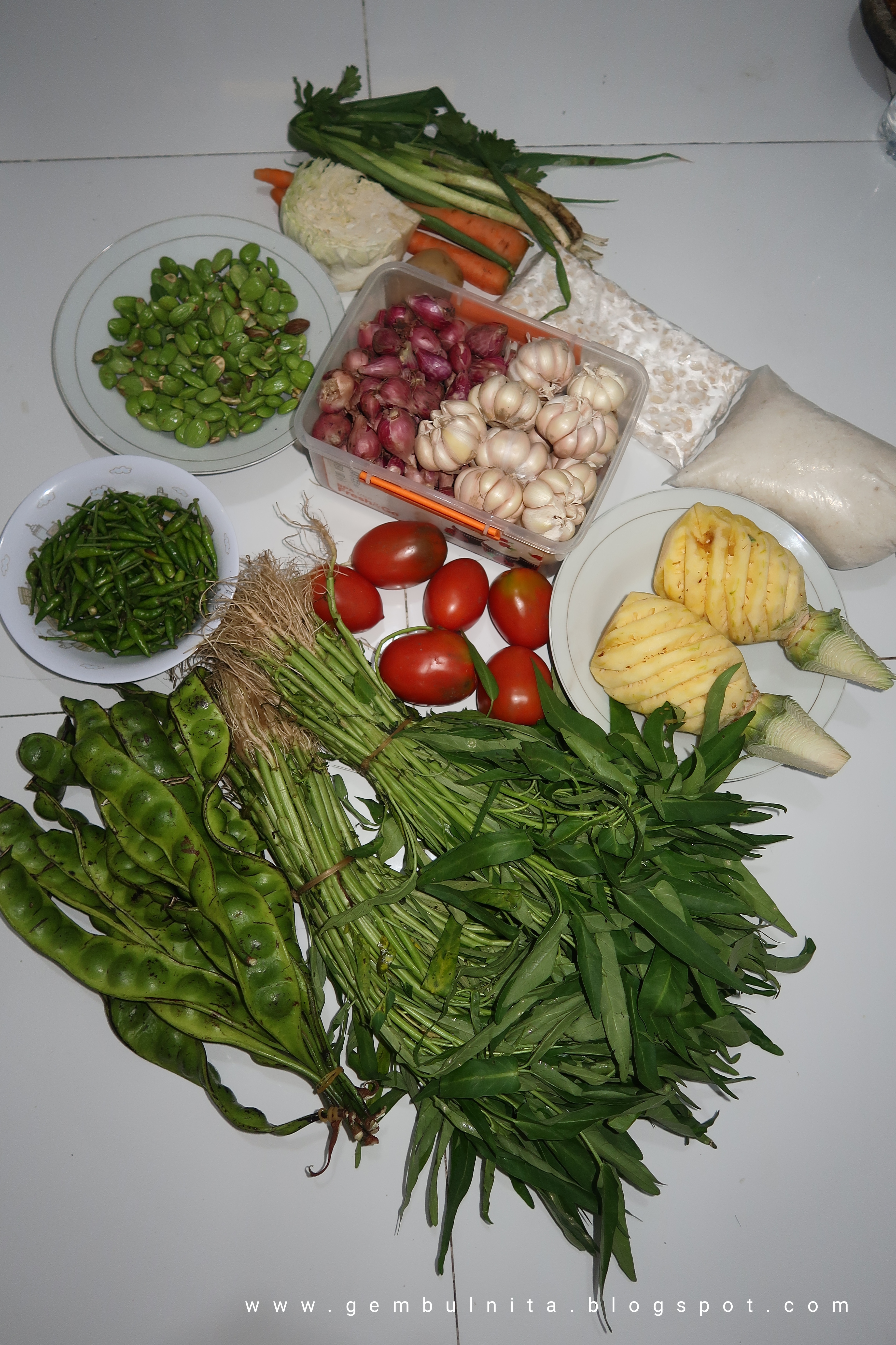 Di pasar kami dapat beberapa hal. Diantaranya kangkung, sop-sopan, tempe, jengkol, pete rencengan, pete kupas, ikan pindang, bawang merah, bawang putih, tomat, sereh, garam, nanas dan jagung manis. Kalau masalah mengingat harga belanjaan Mbul itu paliiiing payah. Makanya Mbul selalu minta tolong penjual suruh rekap harganya. Kayaknya Mbul harus belajar ama Tamaz bagaimana agar bisa mengingat harga-harga di luar kepala. Soalnya Mbul harus ada catatan, hehe.