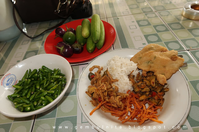 Mbul jadi ber ammm-emmm-ammm-emmm panjang soalnya binund ngeliat lauk dan sayur di atas wadah logam di balik tirai mejanya yang banyak banget itu. Ada tangkil melinjo, tumis usus, orek tempe, kering kentang, sop, gulai nangka, opor ayam, telor dadar, telor bulet balado, ikan peda balado, ayam goreng, gorengan tahu berontak dan tempe tepung, sambel, semur jengkol, perkedel, telor asin, ayam kecap, oseng tempe, tongkol balado, tongkol goreng, tahu kuning goreng, sate jeroan, ikan kembung goreng, tumis tahu campur udang, kikil, bandeng goreng, sepat, tumis kerang, sotong kuah, tumis kacang panjang, tumis kangkung, tumis jamur, lalapan, sambel, dan aneka pepes.