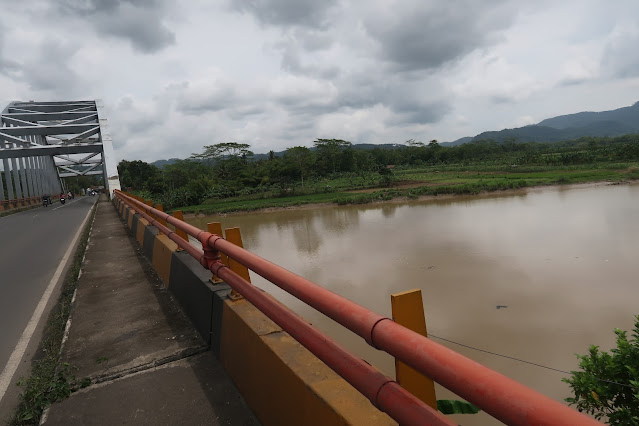 Ow yeah! Akhirnya kendaraan diinggirin dulu, sembari nunggu aku balik ke jembatan buat menangkap moment keindahan jembatan di Sungai Serayu di atas matahari jem 12 'teng'. Sungainya jerniiih banget. Dari kejauhan tampak pegunungan yang menjulang tinggi seperti menyentuh dengan langit. Angin pun semilir berhembus menyentuh pipiku.
