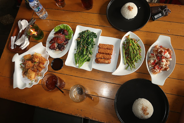 Nah, usai melihat sekeliling, Mbul balik ke meja lagi. Dan menu yang sudah dipesan sudah datang ke meja. Ada nasi, baby kailan tumis bawang putih (onion), buncis sichuan, udang mayonaise, bebek peking (yang size kecil), tempe goreng, dan yang paling the bestnya di sini adalah singkong cabe garam. Agak aneh ya? Biasanya kalau ada menu cabe garam itu kan modelan lauk cumi atau udang. Tapi yang di sini justru singkong. Karena kata Mas singkong cabe garam adalah spesialnya di sini, maka akhirnya pesen juga. Mimiknya, khusus Mbul air mineral aja hehhehe...