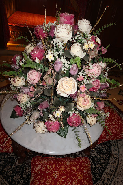 Sebelum memasuki kamar, ada area yang cukup luas dengan keramik cantik. Lalu di depannya ada dipan khusus dengan seprai bermotif batik merah senada dengan bantalan duduk di dekat meja berjambangan bunga (yang berada di atas karpet bundar), juga gorden pintu kayu berpita yang manis dan cute. Di dekat situ ada pula ruangan untuk sholat yang cukup luas.