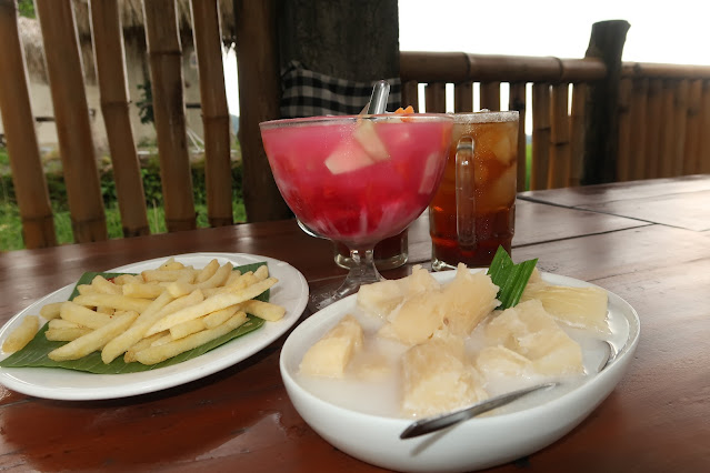 Memang cuaca siang menuju sore itu lumayan panas. Abis olahraga naik turun tangga di Grojogan Sewu ngelih juga. Tapi belum begitu pengen maem nasi. Jadi aku pilih pesen yang seger-seger aja yaitu sop buah, es teh manis dan snack. Snacknya pesen kentang goreng ama Singkong Thailand Original. Nanti bakal diantarkan langsung ke saung dekat kebun kelincinya kalau dah siap.