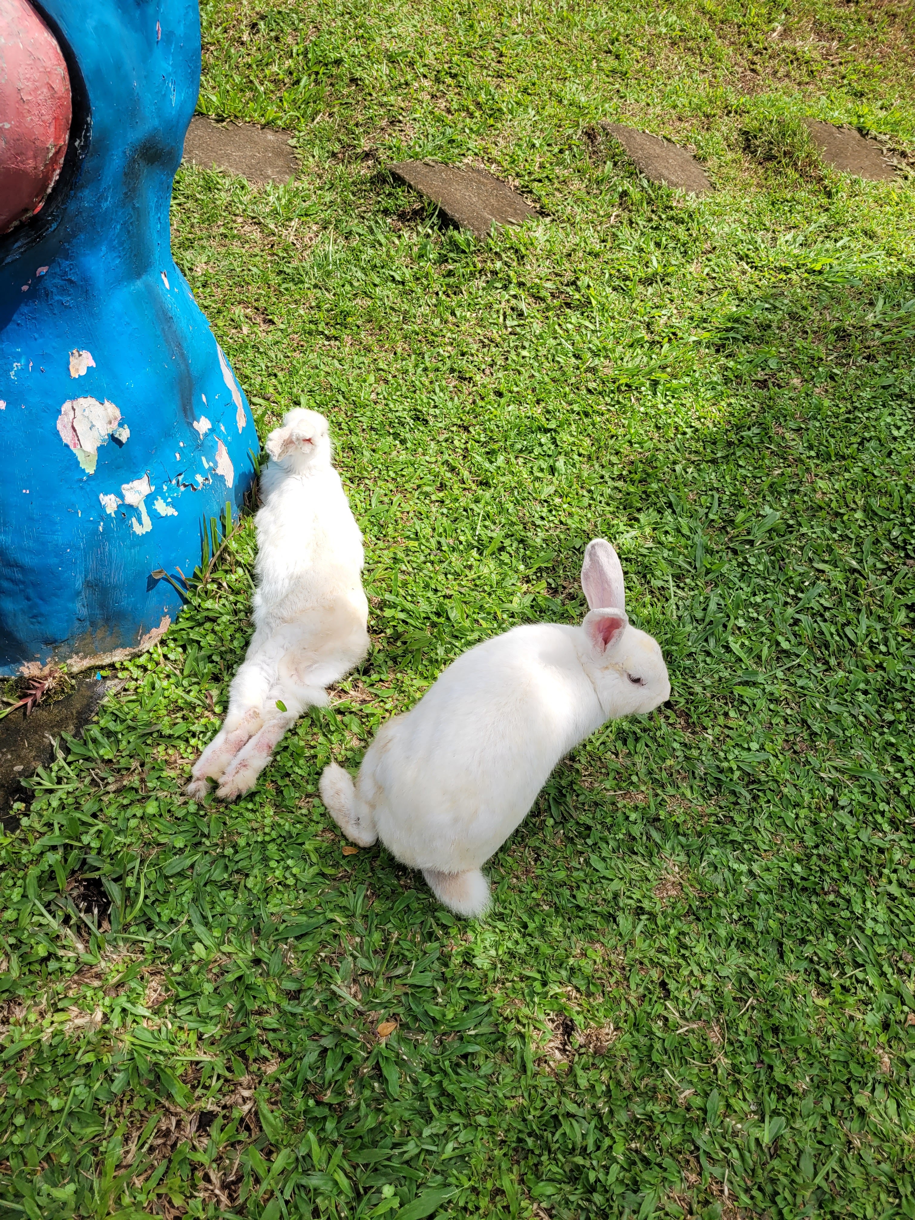 Kelinci-kelinci di sini terdiri dari berbagai macam varietas. Ada yang biasa, ada pula yang anggora. Kalau yang anggora itu yang bulunya lebat. Diwut-diwut. Kalau yang biasa polosan putih aja, matanya merah. Lucu sih. Soalnya gemuk-gemuk. Eh tapi selain yang putih ada juga yang abu-abu putih, cokelat, dan kombinasi. Kuping panjang, imut-imut menggemaskan hahhahah... Seekor kelinci yang berwarna putih tampak sedang birahii tinggi jadi gelisah aja bawaannya...Makanya dia enggan makan..