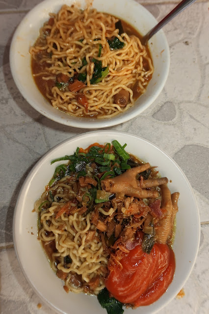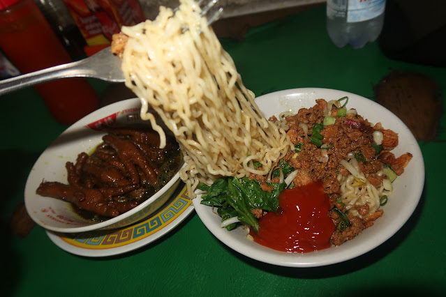 Mie ayamnya itu tipikal mie keriting kecil-kecil yang kenyal. Terus ada ceker manisnya juga. Cekernya sexy sexy kayak yang makan hahhaha...(Baca : Beby Mbul Nita hahah). Dan banyak pula taburan bawang goreng serta daun bawangnya. Itu sih yang bikin wangi dan menambah selera. Porsinya juga lumayan munjung dengan harga yang ramah di kantong.