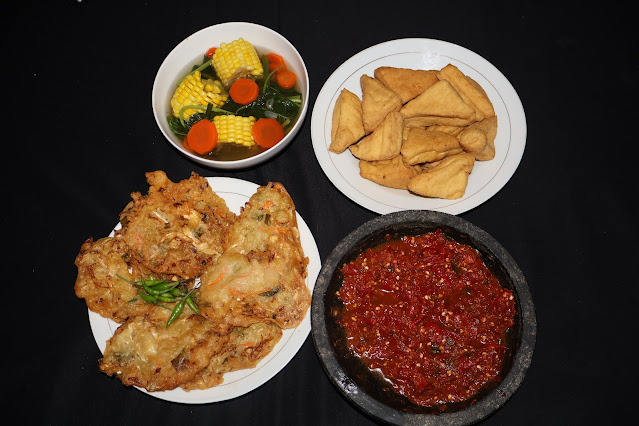 Terus ada bakwan juga. Bakwan kesukaan aku, bakwan sayur yang ada ceplusan cengek ijonya. Bakwan yang bentuknya random aja tapi ga tau kenapa aku suka. Sayur di bakwannya itu ada kubis, wortel dan daun bawang. Renyah pinggirannya tapi menul-menul empuk pada bagian tengah.