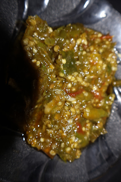 Terus aku juga bikin sambel dadak mentah, yang resepnya hasil aku belajar otodidak dari Tamas kemaren. Tadi pagi aku recook resepnya dan jadilah tadaaaa....sambel dadak mentah bikinanku sendiri. Sukses dong ya. Rasanya gersang, seger merangsang hehehe...Enak, pedes-gurih-haceummm enaaak banget pokoknya.... bikin pengen terus. Haceumnya itu dari air asem jawa. Nah, rasa sambelnya jadi pengen terus deh. Pengen apa Mbul? Pokoknya sambel hasil uleganku itu bikin pengen terus. Bahannya ada cabai merah keriting, cabai rawit dikit aja, cabai cengek ijo, tomat segar, air asem jawa, terasi sangrai, garam, penyedap rasa. Mantab bangat...