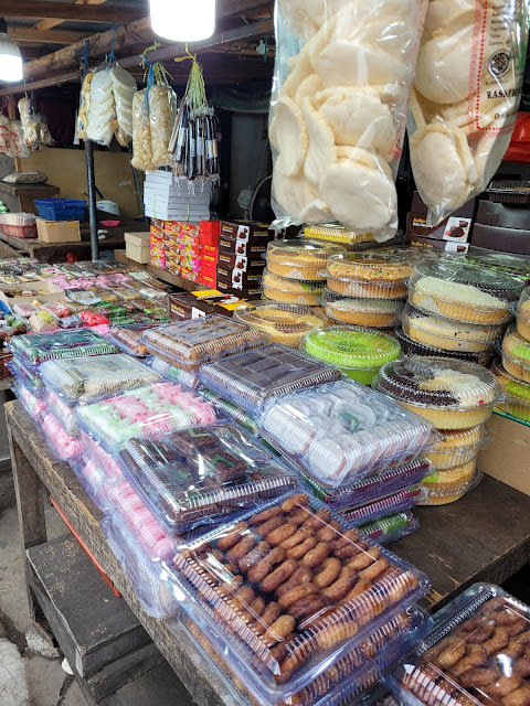 Kalau yang bisa dimaem buat semua itu ya sop baso ayam. Terus ada kue basah juga. Sebenernya kue basahnya ga kefoto. Jadi aku pakai yang udah ada aja waktu aku beli di Pasar kue basah Sitanala. Kue-kue di sini mirip kue subuh Senen. Cuma yang di sini lebih kecil. Tamas bilang dulu ga sekecil ini. Ntah kenapa sekarang mengecil. Tapi dari sisa yang ada kue-kuenya masih tampak menarik hati. Warna-warni gitu. Apalagi kalau nemu yang bentuknya unyu. Imut-imut. Kayak kue mangkok, kue potong, lapis legit, bolu kukus, lemper, gabin, pie susu, kue cincin, talam, kue lumpur, onde-onde, prol tape, mochi, pia, gethuk, grubi, sampai bacang pun ada. Tau ga Teman-Teman, Aku kalau ngeliat bacang jadi inget film apa? Yak betul....film Boboho pas scene makan bacang. Aku kebayang ketannya enak dan dalamnya ada apanya ya? Ternyata isinya itu ada telor asin sama kacang merahnya hahahha...Baru tau aku.