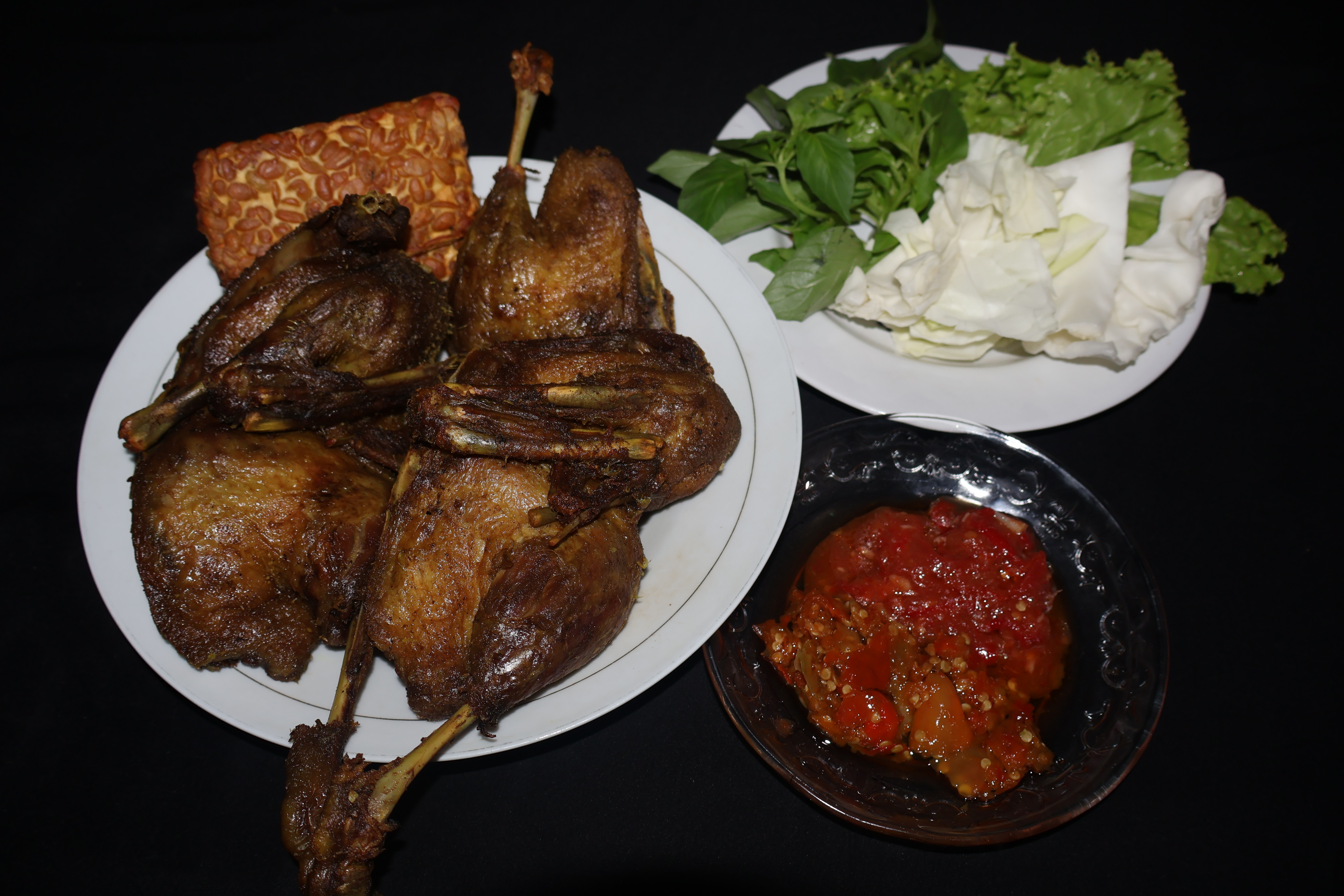 Tamas bungkusin buat kami yang di rumah itu bebek utuh dan tempe goreng polosan. Sambelnya ada sambel bawang dan sambel tomat. Lalap kol, kemangi, seger banget. Alhamdulilah rejeki sore sehabis ujan...