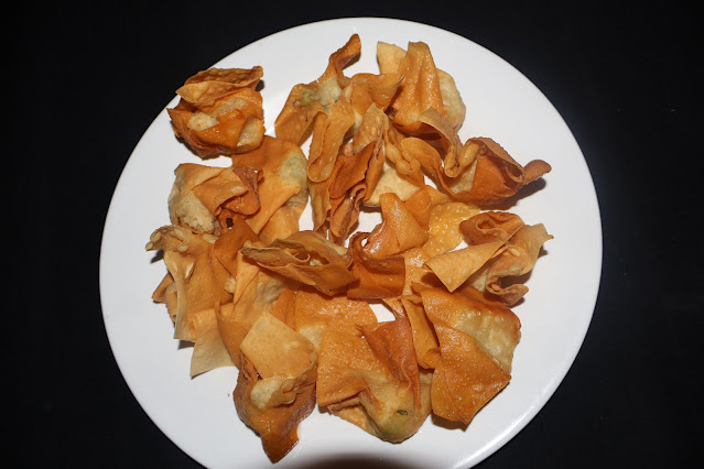 Ambil kulit pangsit, isi dengan adonan isian pangsitnya, kuncupkan beberapa sudut kulit pangsit menyerupai kembangan. Lakukan sampai kulit pangsit dan adonannya habis.