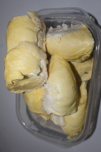 Durian yang dibuka, perbaris itu punya daging buah yang padat berisi (pulen) bertekstur kesat tapi lembuuut di lidah. Warnanya kuning agak putih... Rasanya enak. Legit. Tapi ga dimaem sekaligus abis sih, masih disimpan dalam kotak makan agak banyakan lalu bagian atasnya diwrap taruh kulkas. Ini buat dimaem ntar lagie, biar perut nda patio kembung hehehe.... Tapi kalau di Januari akhir 2025 ini, yang paling mantab itu pas kami kulineran durian di Om-Om bakul durian di pick up-an pas main ke Kuningan, Jawa Barat.